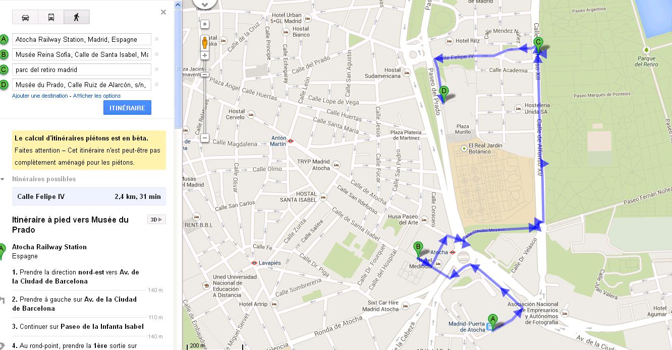 Préparation expresse le samedi, vite la fnac pour un bouquin sur madrid, quelques provisions et la préparation des itinéraires et des valises. J’aime bien calculer les trajets à pieds avec les choses à voir sur les plans google map.