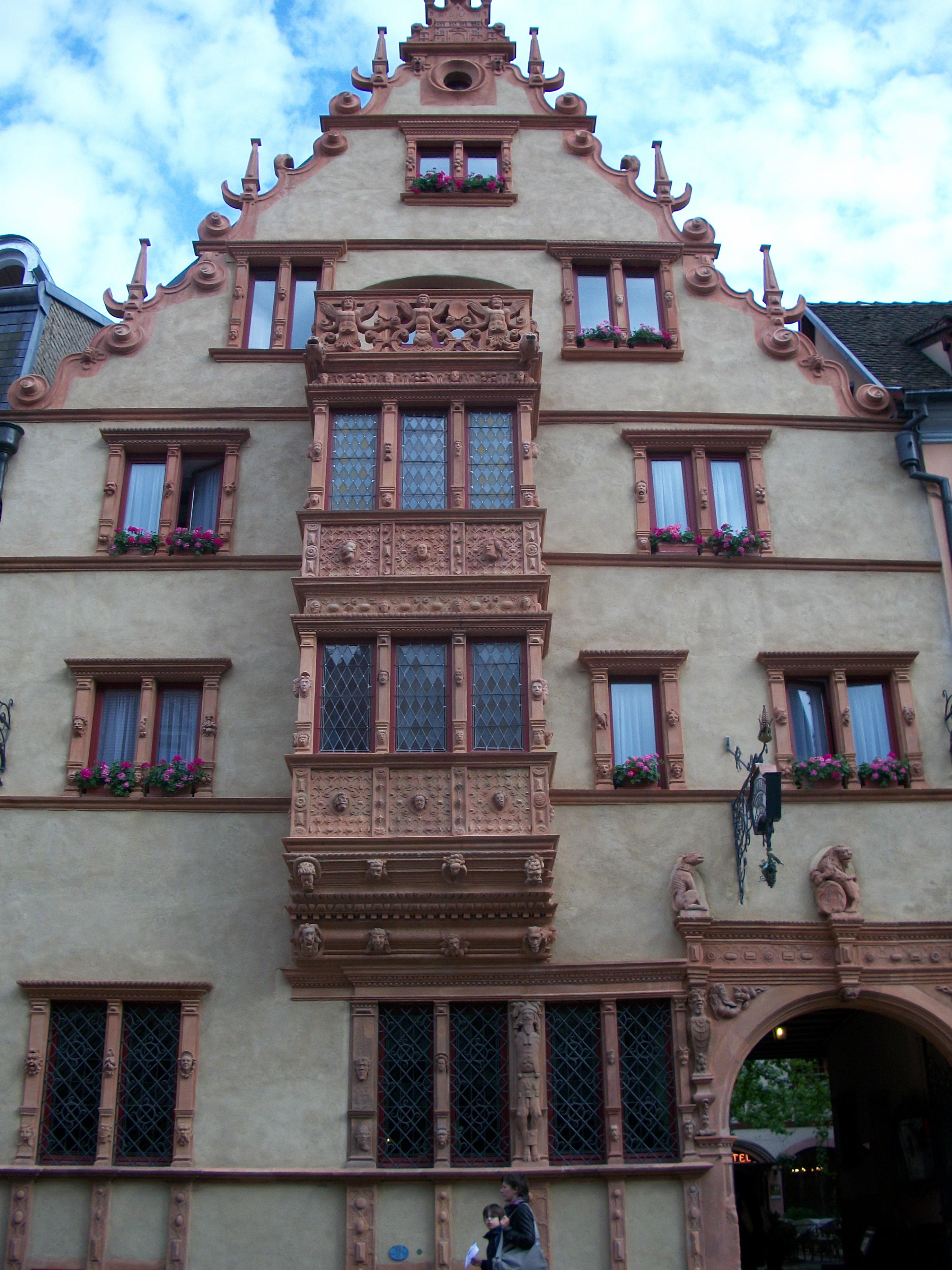 Au sommet, sur le pignon, une statue de Bartholdi de 1902, colmarien d’origine. Celle ci représente un tonnelier, rappelant la fonction de la maison à cette époque, celle de bourse aux vins. Admirez le magnifique oriel qui accueille la plupart des têtes. Le bâtiment abrite aujourd’hui un hôtel-restaurant.