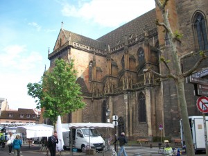 > La Cathédrale : bien que toujours appelée ainsi, elle n’a eu le statut de Cathédrale que durant la Révolution, il s’agit en fait d’une Collégiale, consacrée à Saint-Martin. Construite sous sa forme actuelle entre le XIIIème et le XIVème siècle, elle est de style gothique et construite en grès jaune de Rouffach.