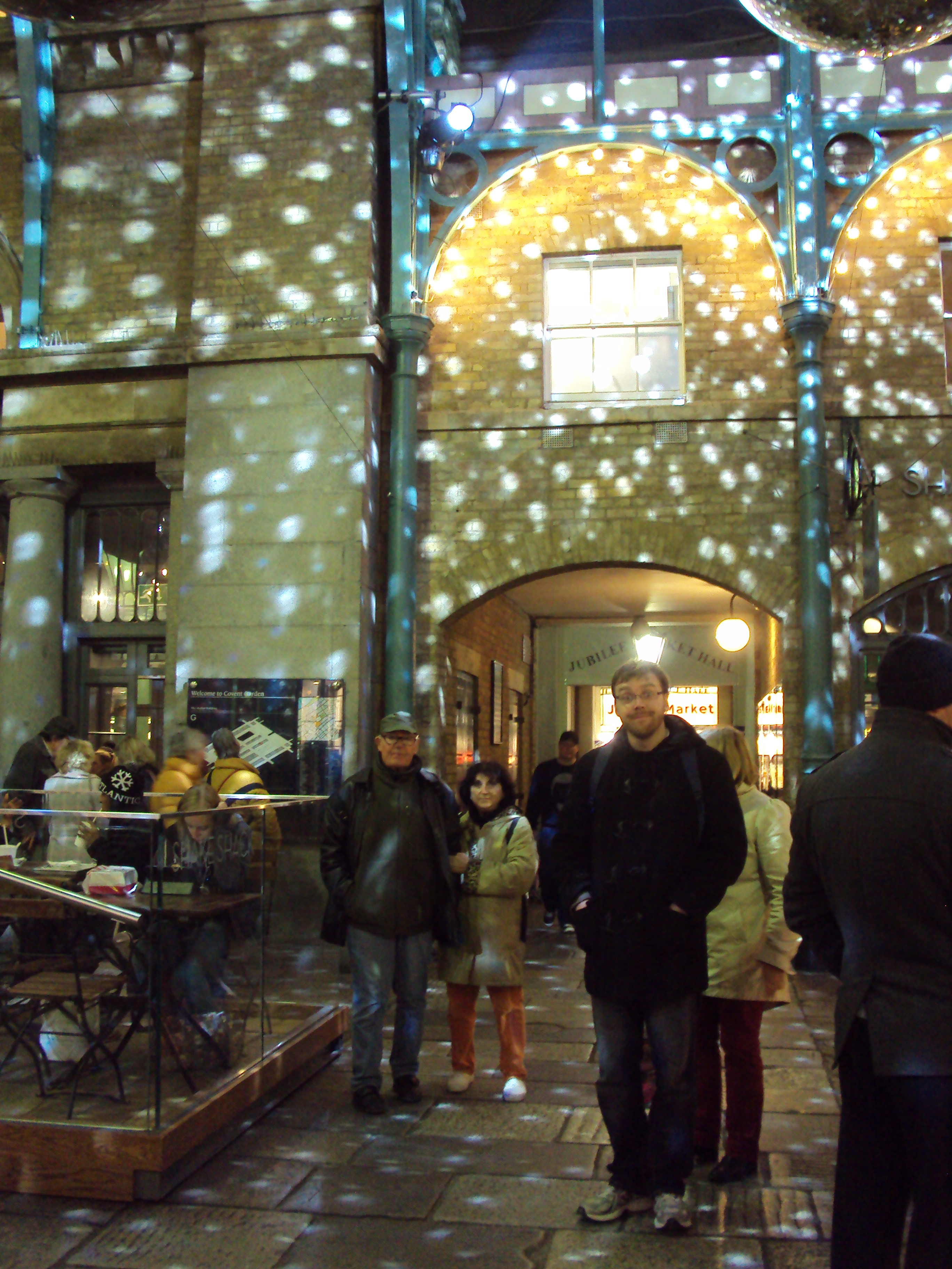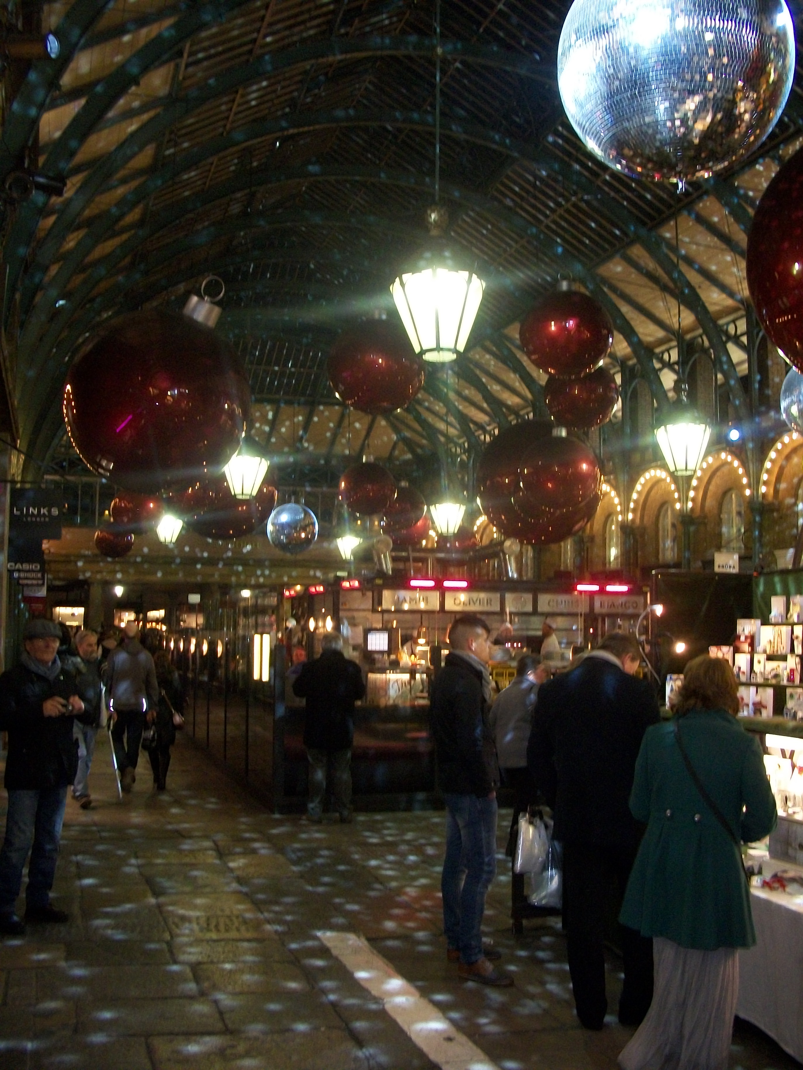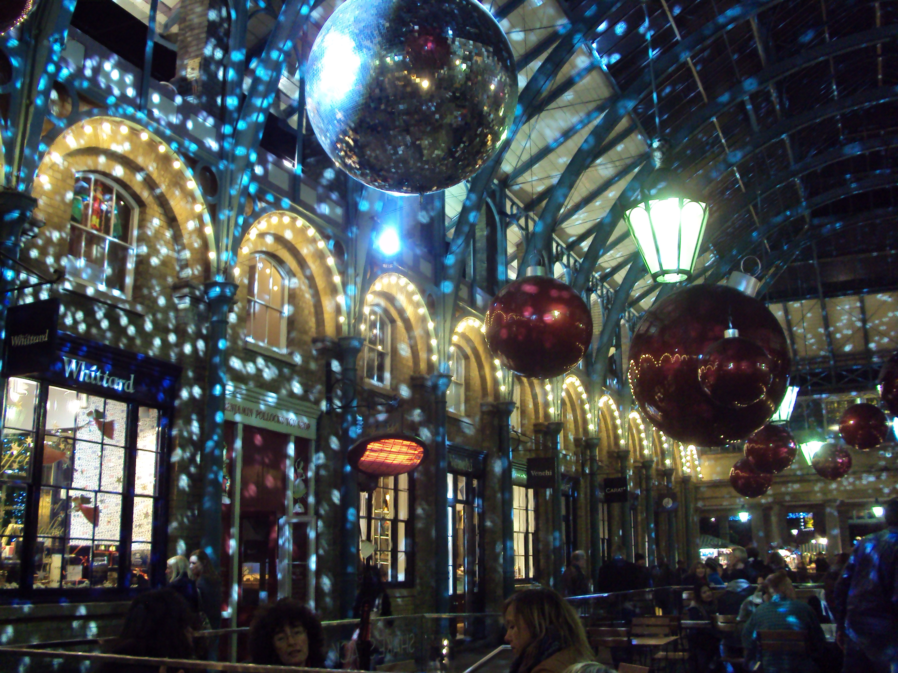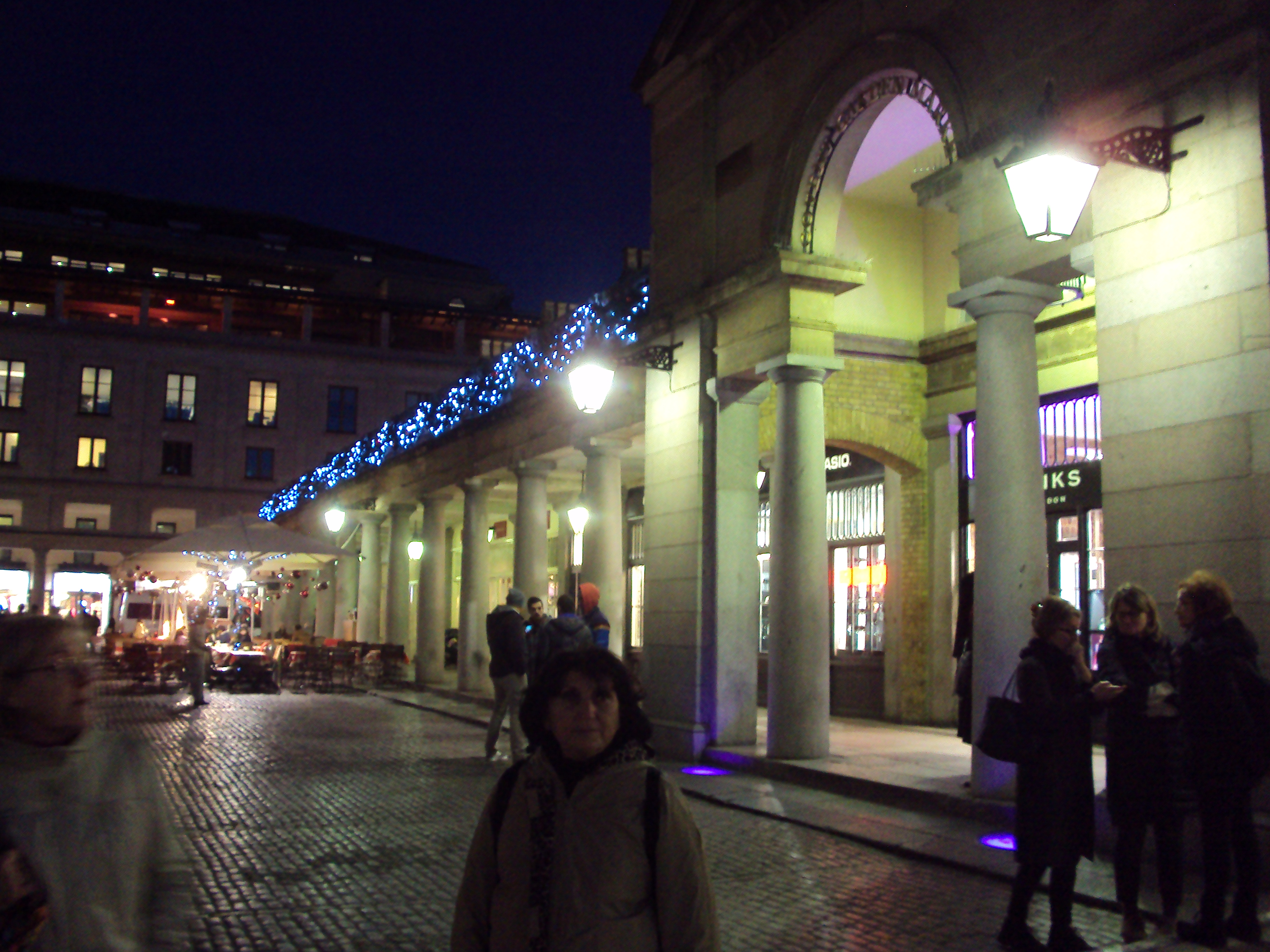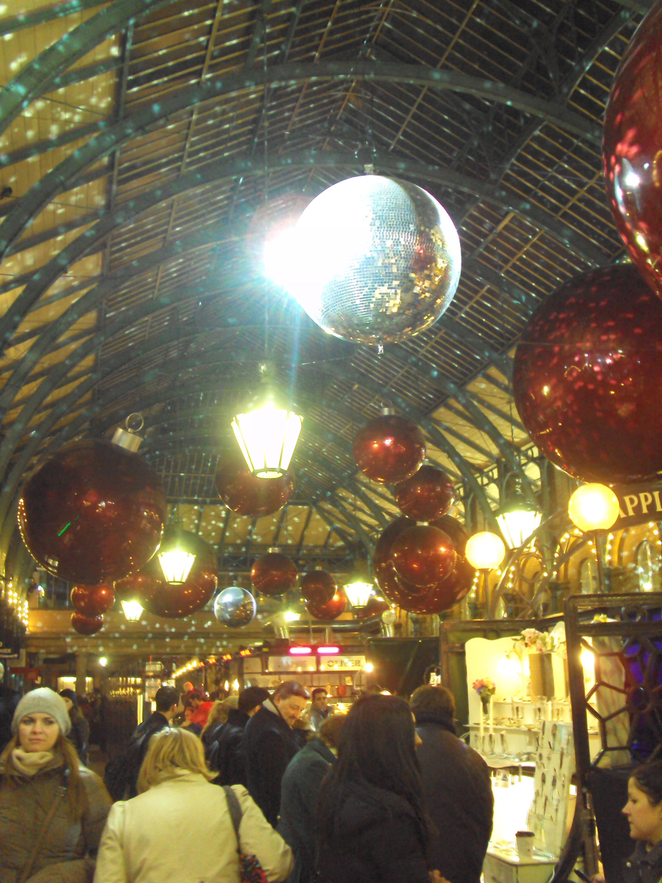 La tombée de la nuit approche (16h), on décide d’aller à Covent Gradens marché/arcades couvertes très fréquentées par les Londoniens fermant à 18h. Vraiment on ne regrette pas, c’était très beau, avec les décorations de Noël en plus. Pleins de petites boutiques dans les arcades, de marchant ambulant.. j’ai trouvé plein de trucs à m’acheter, j’ai même acheté des minis cupcake tous mimis et bons :).
