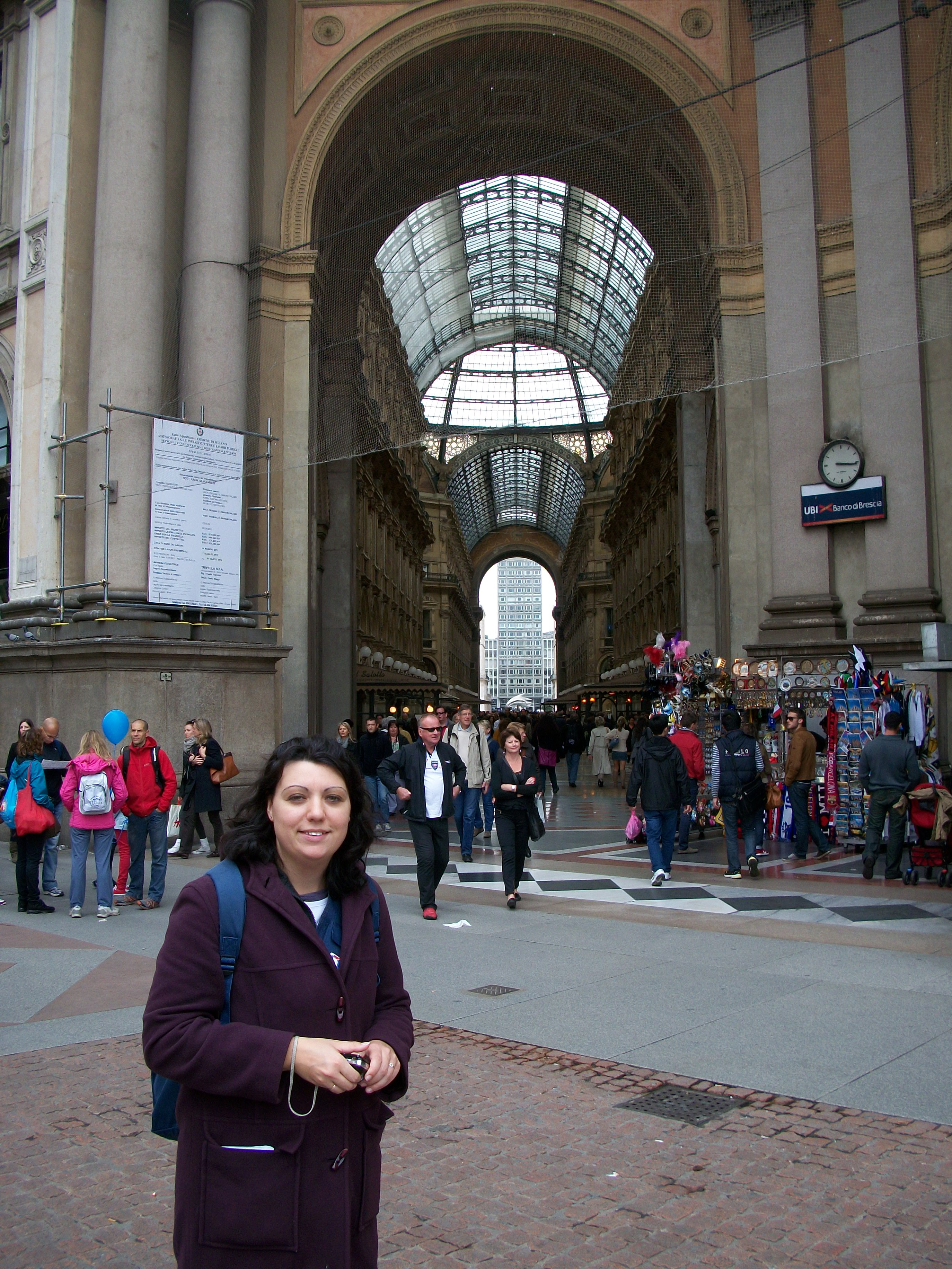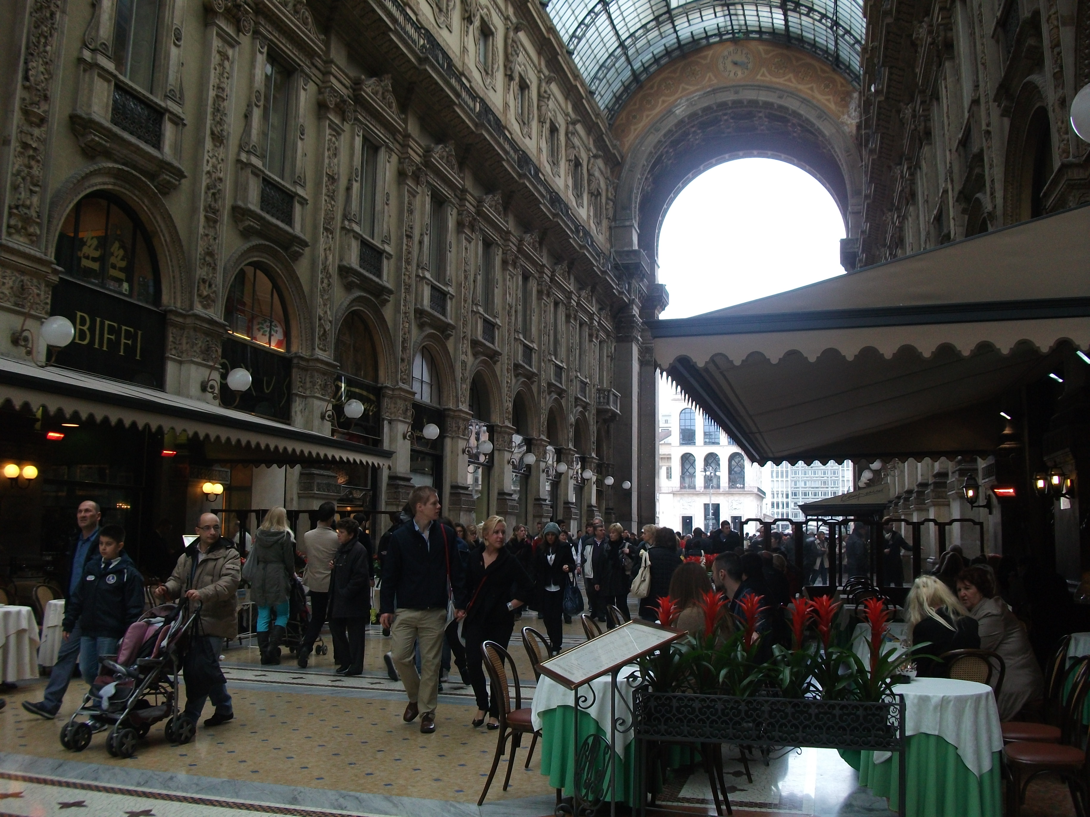 Puis en direction de Dôme on passe la galerie Vittorio Emmanuele qui fut construite en 1867, six ans après la réunification de l’Italie réalisée par Vittorio Emmanuele di Savoia. L’axe de la Galerie Vittorio Emmanuelle II qui part de la Piazza del Duomo mène directement sur la Piazza della Scala, sur laquelle s’élève le théâtre de la Scala. La galerie abrite les magasins les plus chers du monde des plus prestigieux noms de la haute couture ainsi que les restaurants les plus chics. Surnommé Il Salotto di Milano (Le Salon de Milan), la Galerie Vittorio Emmanuele II est une des plus belles galeries d’Europe. Elle contient de superbes arcades ainsi qu’une magnifique coupole de fer et de verre. Lieu traditionnel de rencontre et de promenade.