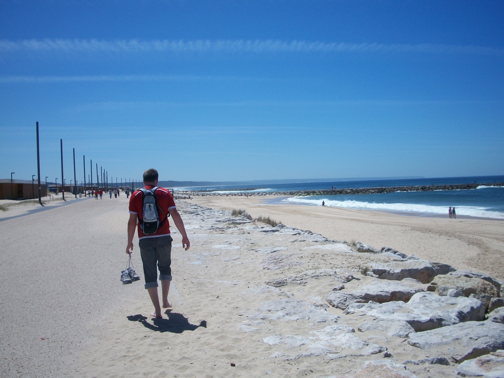 On trouve l’arrêt de bus mais dans quel sens… après renseignements auprès de gens en disant « Costa Da Caparica » ils nous font signe que oui et nous préviennent quand notre bus arrive ligne 124 à retenir pour le retour. Par contre le chauffeur pas un mot de Français mais il a su encaisser 8€ de trajet!!! Au cours du trajet on en voit du paysage et des bleds!! About de 40 min on voit plein de gens descendre (out le bus en fait casi plein) et je vois des affaires de plage dans les boutiques on se dit c’est la rue Dr Aresta branco. En remontant Praça da Liberdade et enfin R.Dos Pescadores.