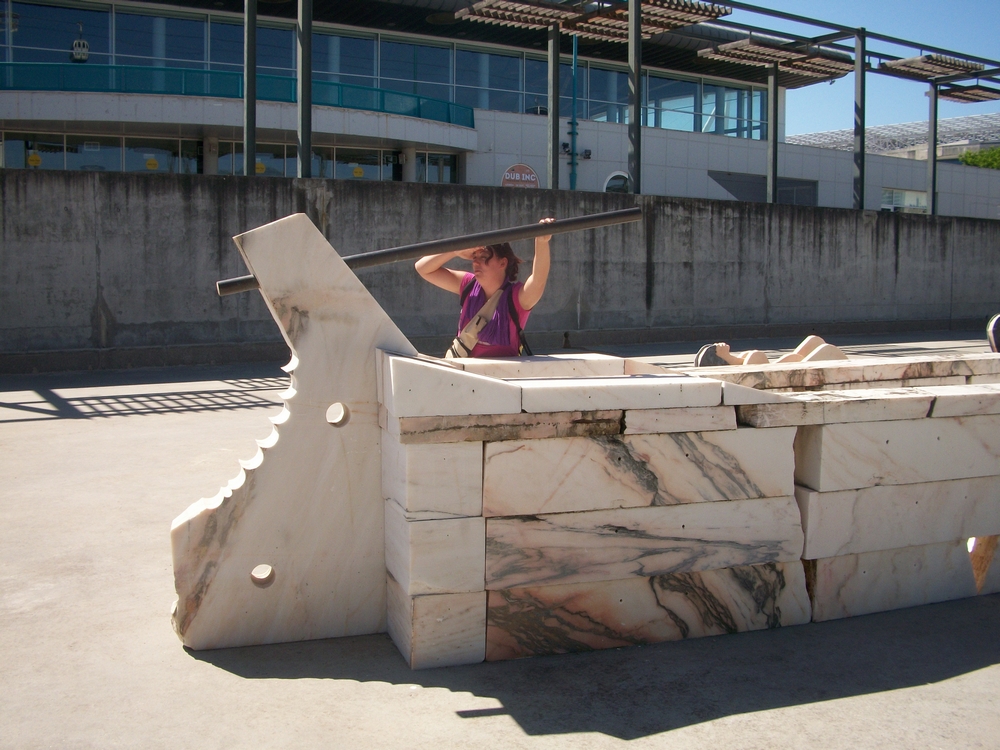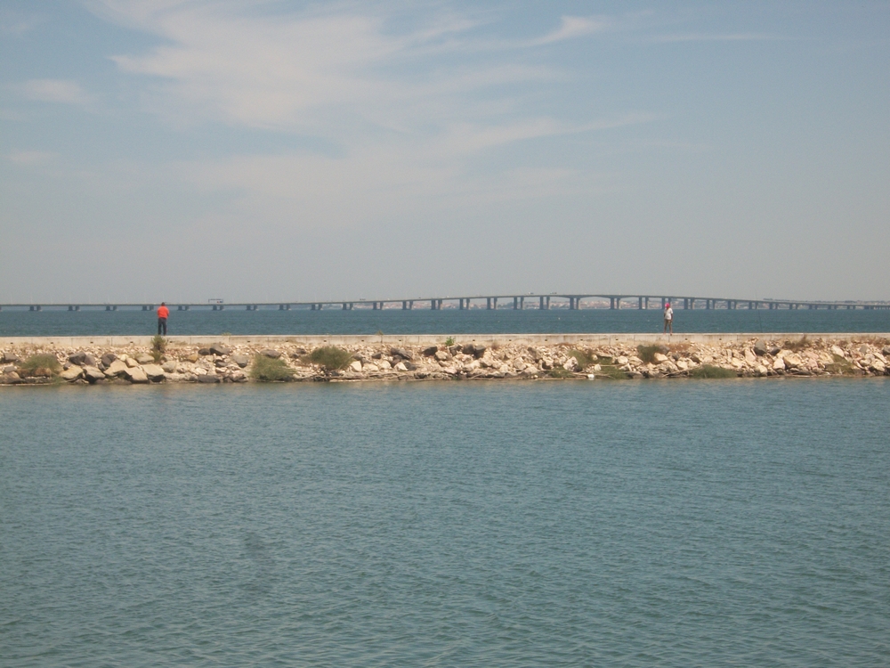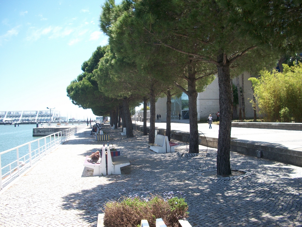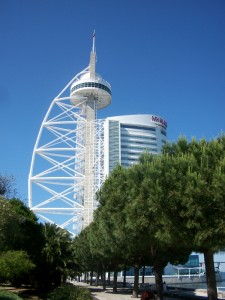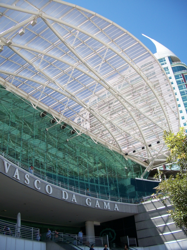 On se rend quasi au pied de la Tour Vasco de gama où l’on est très proche du Pont de Gama, viaduc continu qui franchit l’estuaire du Tage en sa partie large, au nord de Lisbonne sur une distance de 12,3 km1. Sa longueur hors-tout de plus de 17 km en fait le plus grand d’Europe2 et le 27ème plus grand au monde. La construction a commencé en 1995 et le pont a été ouvert au public le 29 mars 1998, juste avant l’exposition universelle Expo ’98 qui célébrait le 500e anniversaire de la découverte de la route maritime vers l’Inde par Vasco de Gama. Conçu pour résister à un tremblement de terre 4,5 fois plus puissant que celui de 1755 et à des vents atteignant 250 km/h, il est bâti sur des pieux de 2,2 m et 1,7 m de diamètre et ses fondations s’enfoncent à 95 m en dessous du niveau de la mer. Du fait de la longueur du pont, la courbure de la Terre a dû être prise en compte dans le calcul de l’emplacement des piles : sans cela, une erreur d’un mètre serait apparue au bout du pont. Son coût de construction est estimé aux environs de 900 millions d’euros.