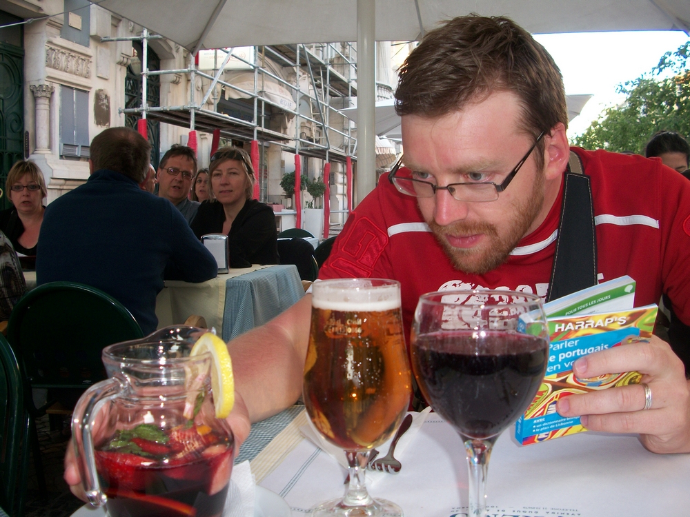 on se pomponne vite fait à la chambre (car on a transpiré aujourd’hui) et on file manger à un petit restau que l’on a repéré en sortant du métro vers le mcdo. j’ai enfin eu ma salade de poulet et Ben sa morue « bacchaloh ». Mais en apéro Sangria avec des fraises 50cl et Ben bière, on était pompette, le serveur nous avait à la bonne il nous a pris en photos…