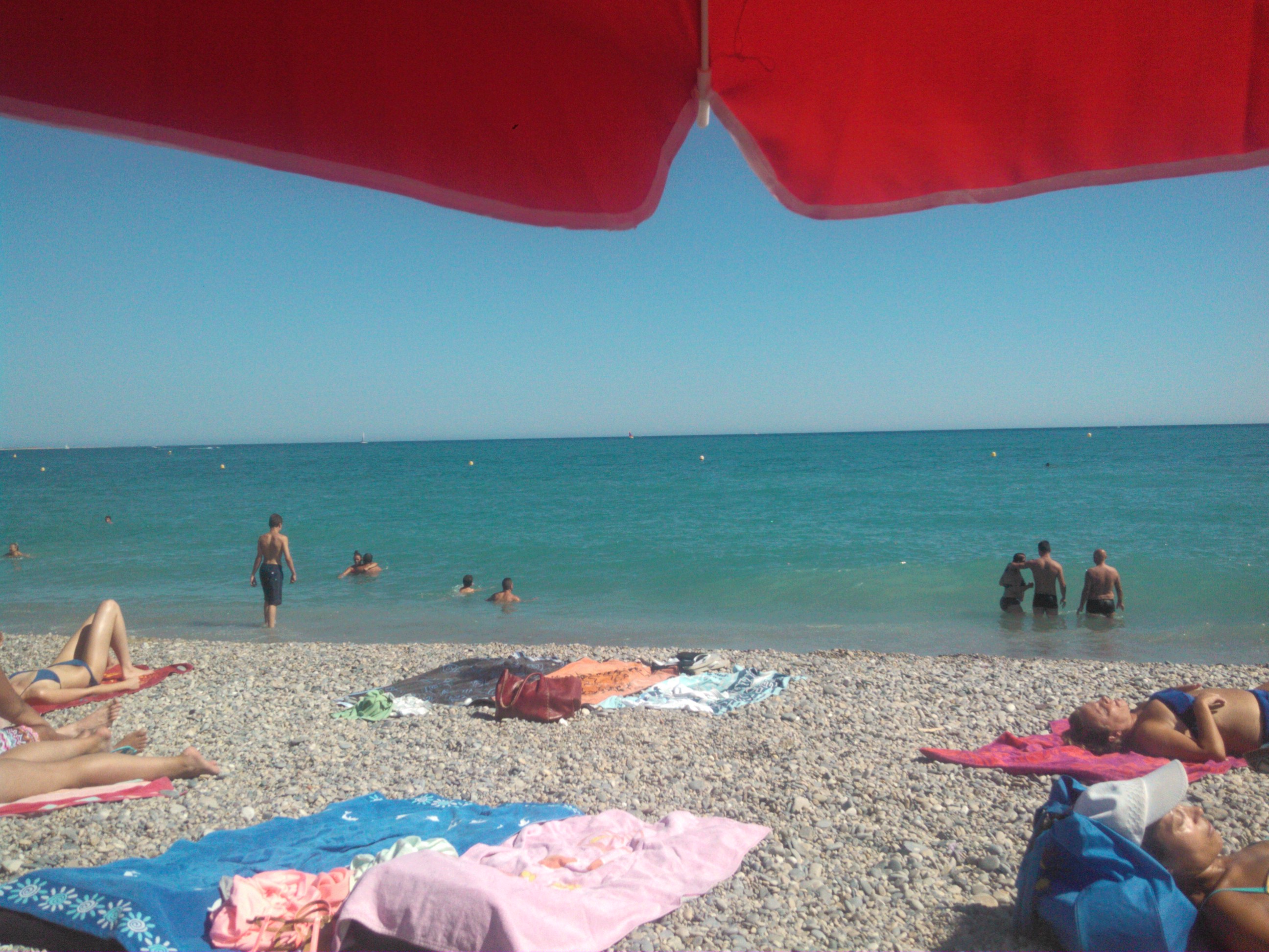 Nous avons pu nous garer sous l’hôtel, il y a quelques places un peu exigus, nous avons donc récupéré les chambre, enfilé un maillot et filé à la plage. En route sur le bvd Maréchal Juin, il y a un carrefour city et un spar ouffff on a pu s’acheter une salade et un croc monsieur afin de manger sur la plage. Heureusement j’avais pensé à prendre des matelas pour se mettre sur les galets. Le parasol a pu être installé aussi en grattant parmi les cailloux on a pu coincer le pied.