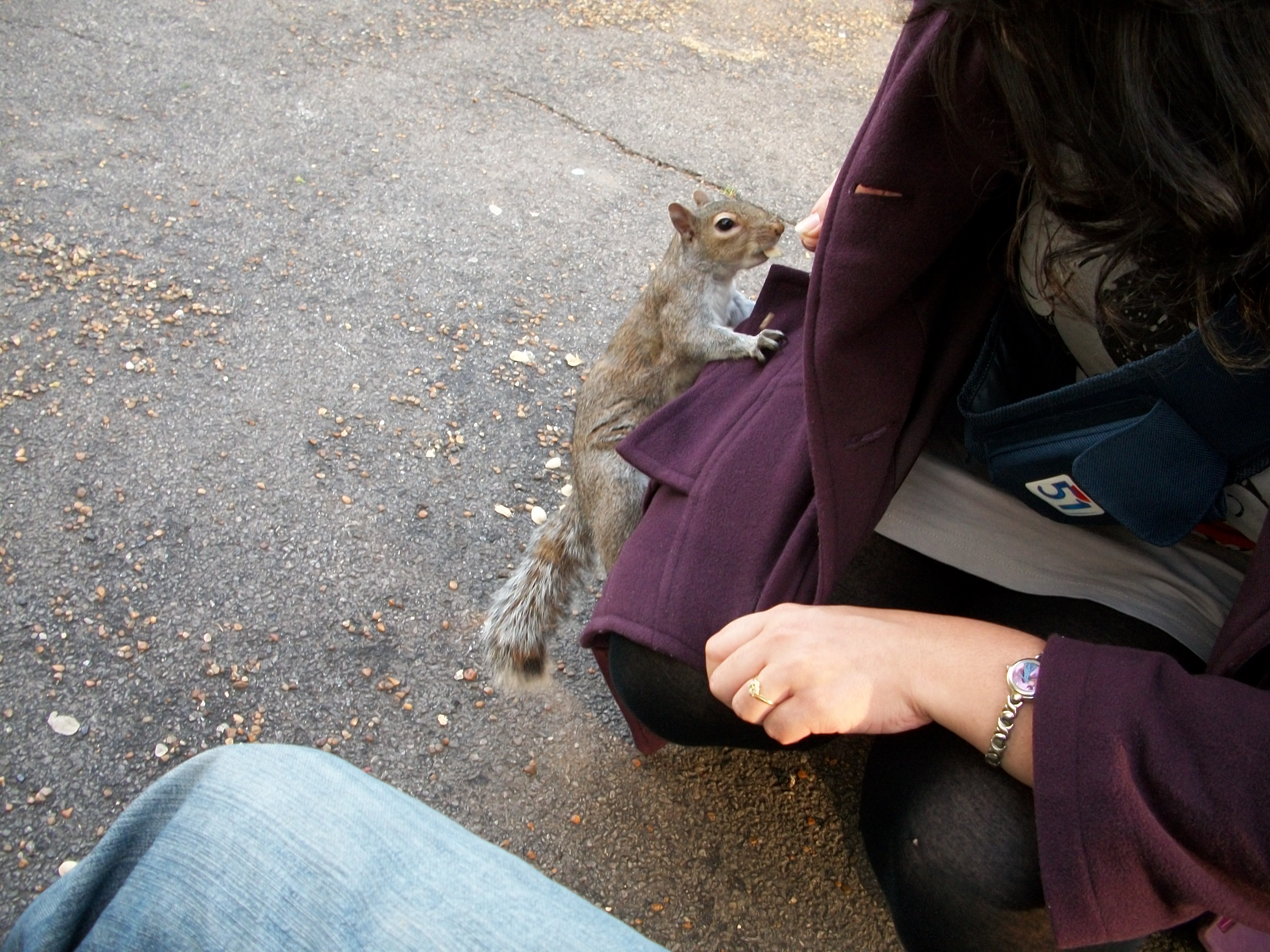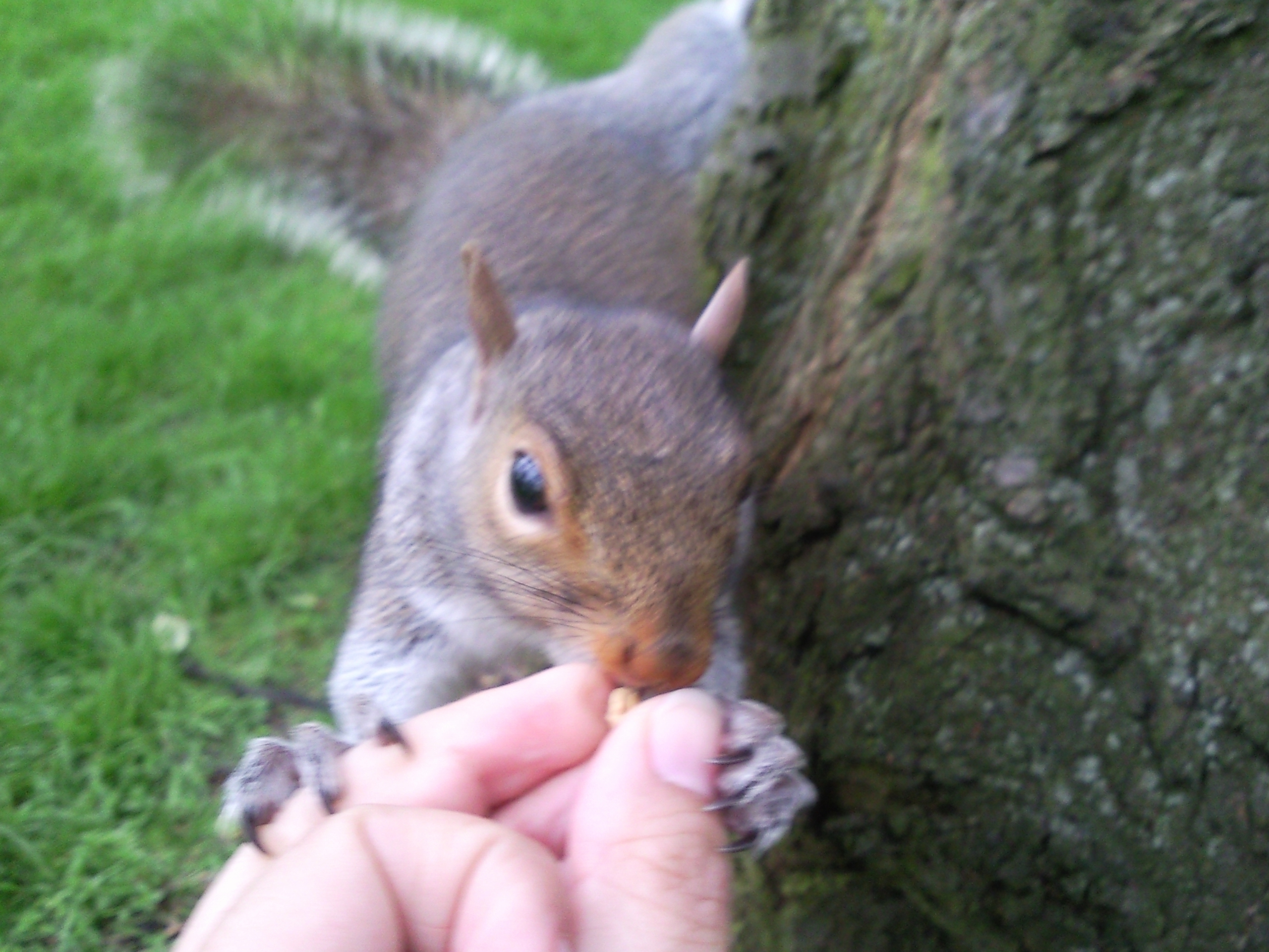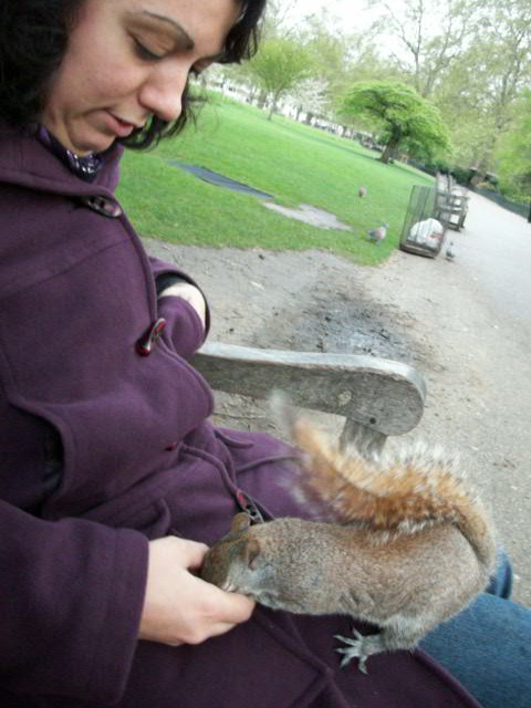 Bon, les écureuils adorent les cacahuètes mais il faut faire attention en donnant à manger! Plus l’animal sera timide et peureux plus il risque de vous faire mal. En tout cas, si l’écureuil arrive doucement, s’aplatit ou frémit de la queue, ne vous risquez pas à le nourrir directement dans la main. Il ne vaut mieux pas laisser trainer un doigt (Hyde park) :