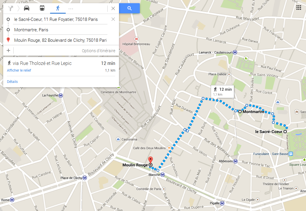 Sortie du métro Blanche ligne 2 (changé à Stalingrad ligne 5 depuis Austerlitz) on arrive face au fameux Moulin Rouge… bon j’avoue il est sympa mais les alentours bof bof… Le Moulin Rouge est un cabaret parisien fondé en 1889 par Joseph Oller et Charles Zidler, qui possédaient déjà l’Olympia. Il est situé sur le boulevard de Clichy dans le 18e arrondissement, au pied de la Butte Montmartre1. Son style et son nom ont été imités et empruntés par d’autres cabarets dans le monde entier.