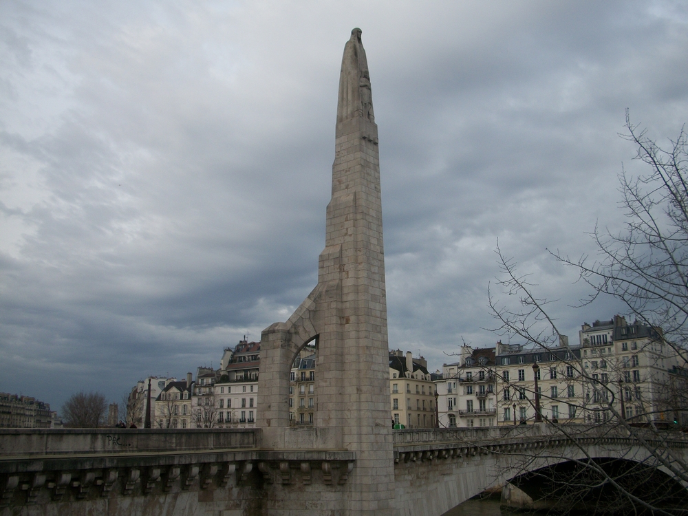 On est passé devant le pont de la Tournelle, surmonté d’un pylône de près de 15 m surmonté par une statue de sainte Geneviève, patronne de Paris, réalisée par Paul Landowski ; elle protège la ville de Paris, représentée sous les traits d’une fillette serrant contre elle la nef.