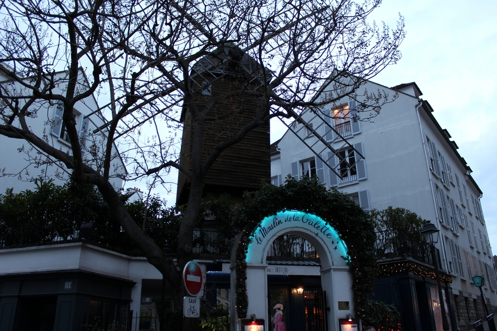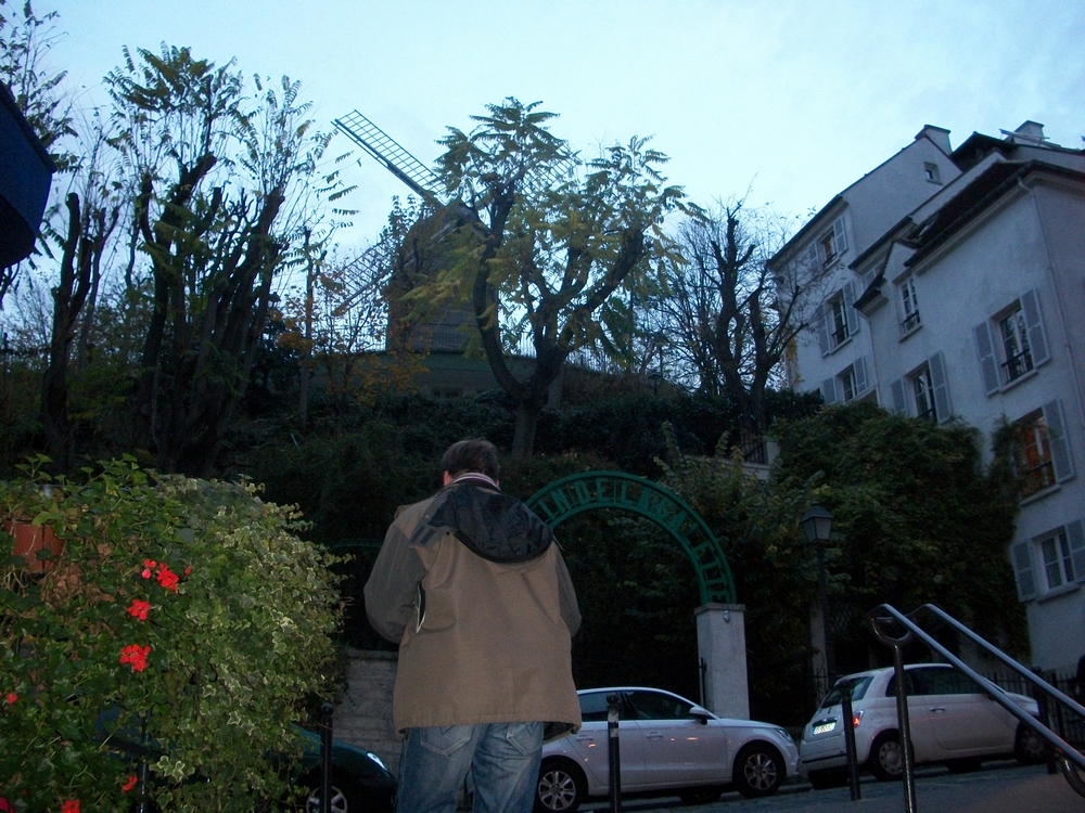 On se dirige vers le cœur de Montmartre en remontant le rue derrière le Moulin Rouge, on passe devant une énorme crêperie surmontée de 2 moulins…