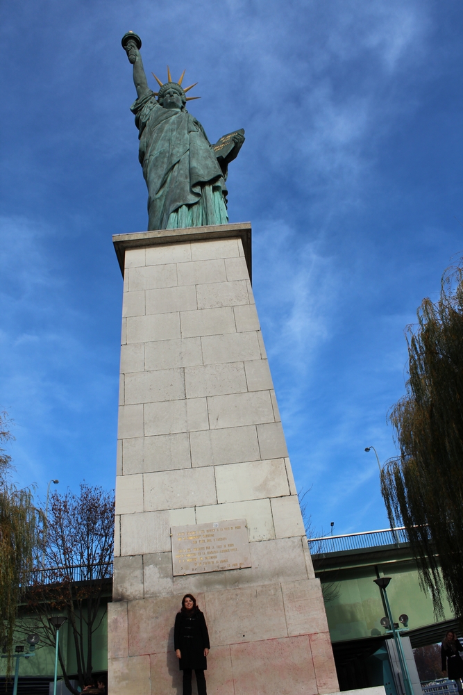 En 1885, une autre réplique est coulée en bronze. Cette statue fut offerte à la France par le Comité des Américains de Parisà l’occasion du centenaire de la Révolution. Elle est placée à l’extrémité aval de l’Île aux Cygnes à la hauteur du pont de Grenelle, à proximité de l’endroit où se tenait l’atelier de Bartholdi. On peut lire sur sa tablette « IV JUILLET 1776 = XIV JUILLET 1789 ». Elle fut inaugurée par le président Carnot le 4 juillet 1889, 3 ans après la « new-yorkaise », en présence de son créateur. Elle avait été orientée dans l’autre sens, pour éviter au président Carnot de devoir l’inaugurer en barque ou de dévoiler une statue lui tournant le dos, mais Bartholdi demanda expressément à ce qu’on la dirige plutôt vers New York, ce qui fut fait en 1937, lors de l’exposition universelle.