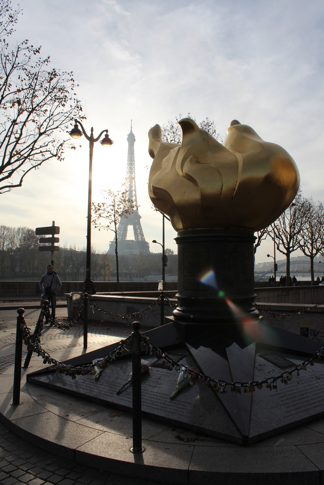 Puis on a vite repris le rer C (correspondance pour pas payer un nouveau ticket) pour aller au Pont de l’Alma la réplique de la flamme de la statue, la Flamme de la Liberté, offerte par les États-Unis à Paris se trouve place de l’Alma (8e et 16e arrondissements) depuis 1989. Elle est devenue mondialement connue en devenant le lieu de recueillement à la princesse Diana, morte en août 1997, dans le tunnel de l’Alma qui passe sous le monument.