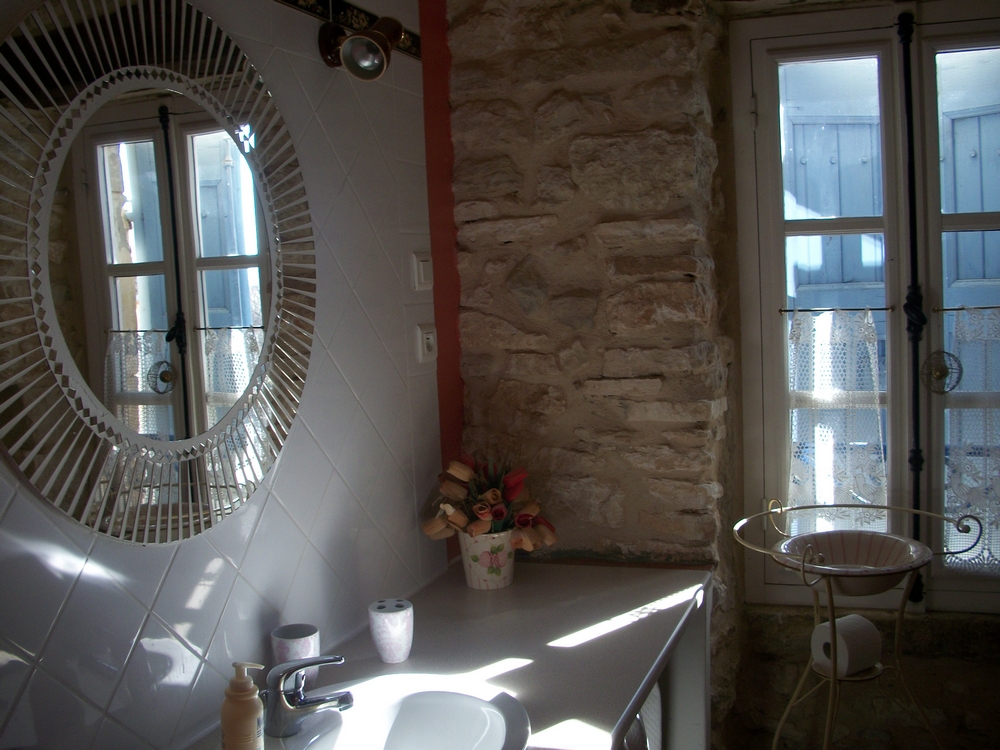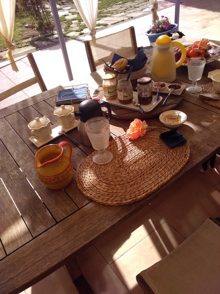 Le petit dej était servi entre 9h30 et 10h30. On s’est pointé à 10h15 (normal!!) et la dame nous dit « oh c dommage les 2 autres personnes ont déjà mangé vous n’aurez pas fait connaissance… » ouf tant mieux. Journée de la femme j’avais une belle rose à ma place. Petit déjeuner en extérieur tellement il faisait bon et chaud, et avec les 6 petits chiots youpi! Croissant, tartines confitures et miel au thym hum.
