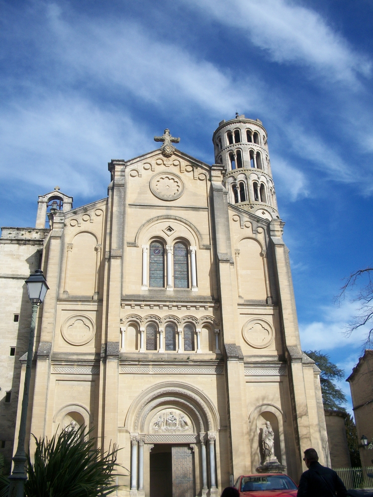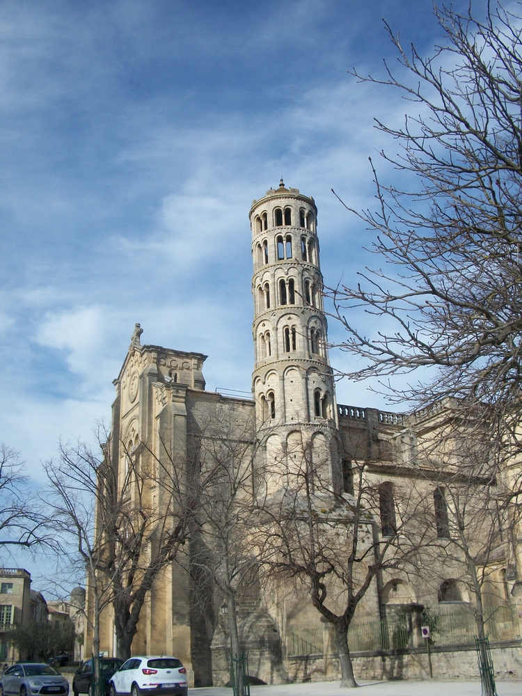 On remonte à pied vers la place de l’évêché. Comme son nom l’indique, cette place contient l’ancien évêché d’Uzès – aujourd’hui reconverti en musée municipal consacré à la peinture – de même que la cathédrale Théodorit et surtout la tour Fenestrelle, que vous aurez sans doute remarquée en premier en arrivant sur les lieux. Il s’agit du seul campanile de style Lombard (italien) visible en France. Érigé à partir du XIe siècle, l’édifice constitue un des rares édifices religieux épargnés par les protestants après l’édit de Nantes (1598).