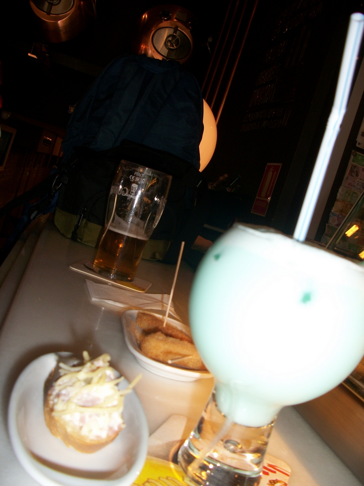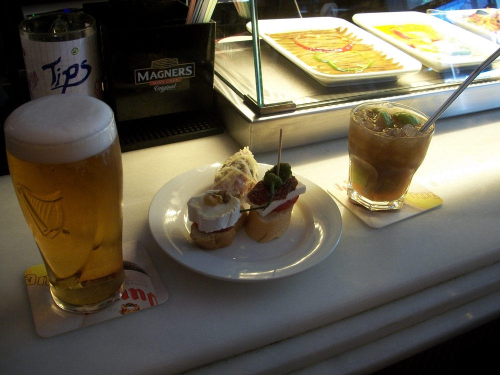 Ayant beaucoup trop de monde sur le marché pour s’instalelr manger quelque part, le midi nous avons grignotés/mangés dans un bar avec des cocktails et pinchos (petites bouchées) au Hogan’s bar, pas loin du mercato de la Boqueria.