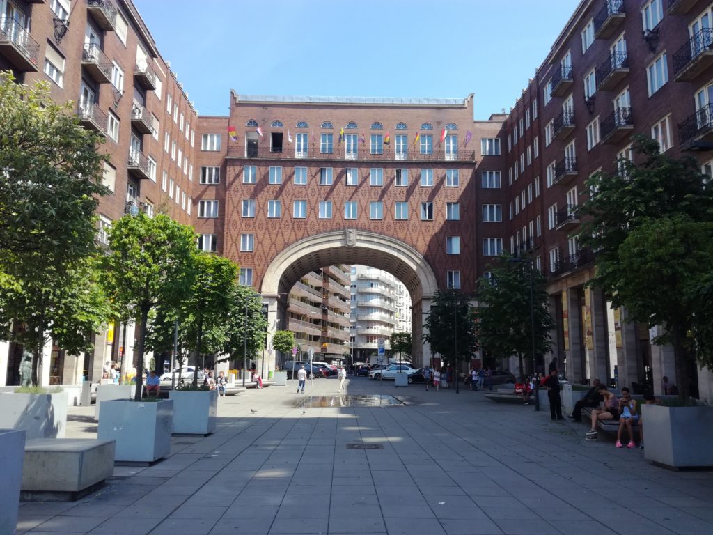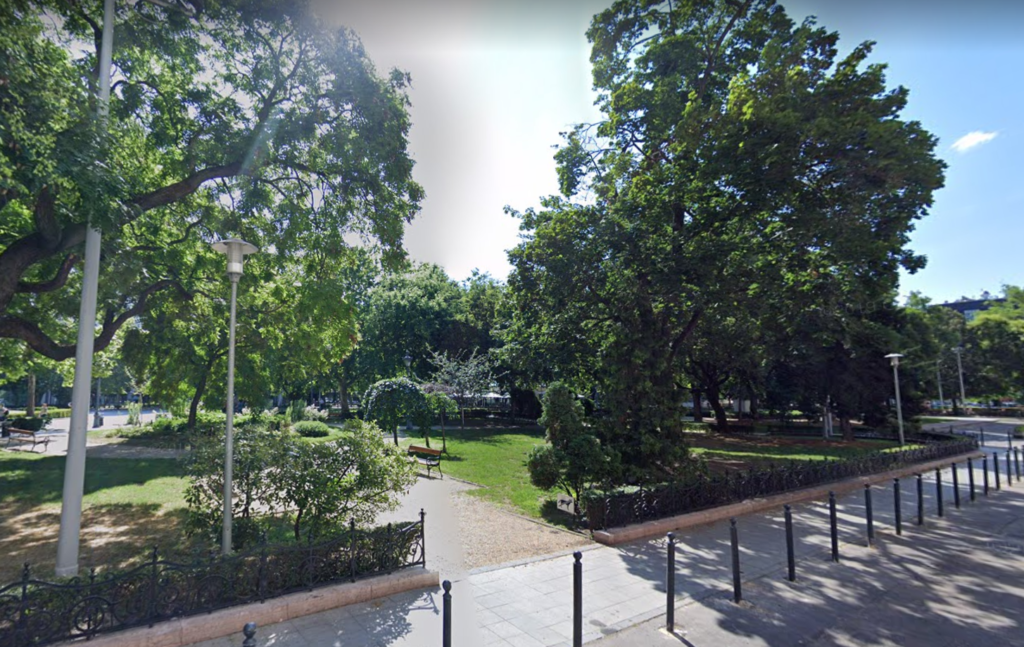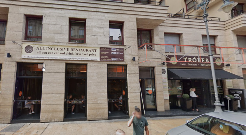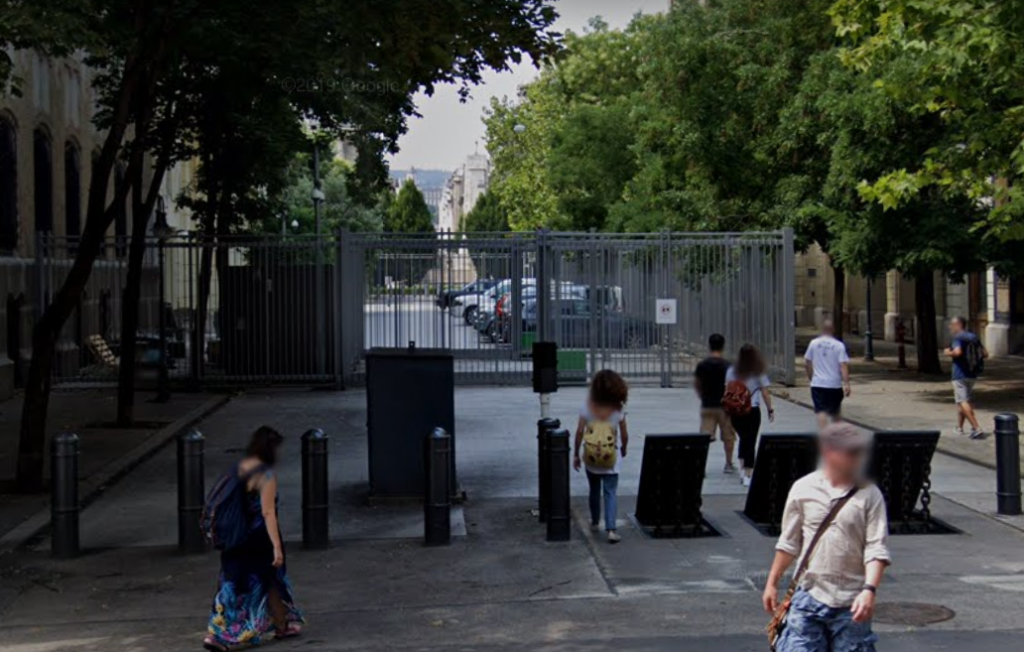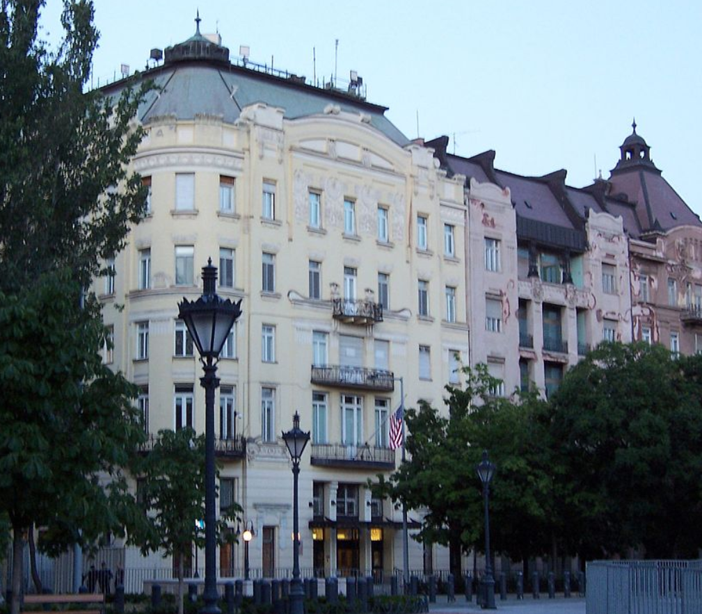 En sortant des halles où je me suis trouvée un cinnamroll, je décide d’aller le manger dans le parc à côté Szabadság tér Relaxed park with monuments & play areas (place de la liberté), mais pour y arriver il faut tout un detour alors qu’on en est à 100m à pied, il se trouve qu’il y a l’ambassade des États-Unis en Hongrie très protégé et grillagé…