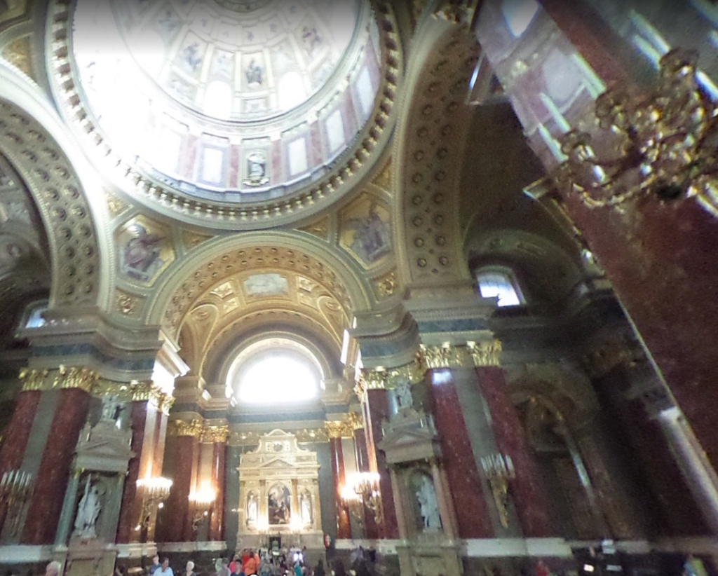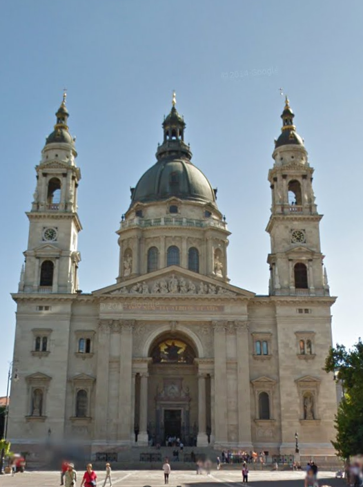 coupole néo-Renaissance après l’effondrement de celle d’origine en 1868. Sa conception inspirée de la Renaissance, s’harmonisait bien avec les plans initiaux conçus dans un style néoclassique. Il en résulta un édifice d’aspect équilibré, malgré les contradictions provenant du mélange des styles. Un troisième architecte travailla aussi à sa réalisation, qui acheva, en 1905, les travaux de construction commencés 54 ans plus tôt. Avec le parlement, la basilique est le bâtiment le plus haut de Budapest (96 m). Ses dimensions imposantes (87,4 m de long sur 55 m de large) en font le deuxième plus grand édifice religieux du pays sa capacité d’accueil s’élevant jusqu’à 8 500 personnes. Les murs de la basilique se dressent en forme de croix grecque. L’espace intérieur se divise en neuf parties. La partie centrale est recouverte par la coupole, la nef par une voûte en berceau. Les statues du tympan de la façade, celles des tours et celles de la partie extérieure de la coupole, sont l’œuvre de Leó Feszler. L’intérieur est orné de mosaïques, de tableaux, de sculptures des plus grands artistes hongrois. Une des chapelles conserve la plus importante relique Hongroise : la Sainte Dextre, la main droite momifiée supposée du premier roi hongrois Étienne auquel l’église doit son nom.