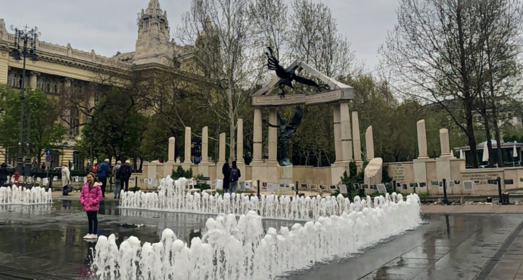 Le monument érigé sur la place en juillet 2014 représente l’archange Gabriel tenant l’orbe royal hongrois, attaqué par l’aigle allemand dont la patte indique la date de 1944 sur un anneau.
