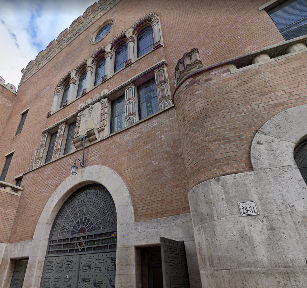 La façade principale sur la rue, présentant un décor de briques polychromes, est marquée par une inspiration mauresque, avec des tours semblables à des minarets. Cette influence se retrouve dans la salle principale de la synagogue, de forme octogonale, qui est généreusement éclairée par une lanterne octogonale et par de grandes baies circulaires. Le premier étage comprend une galerie réservée aux femmes, qui s’ouvre sur l’octogone de la salle.
