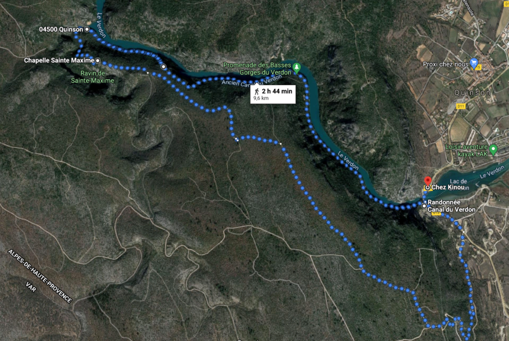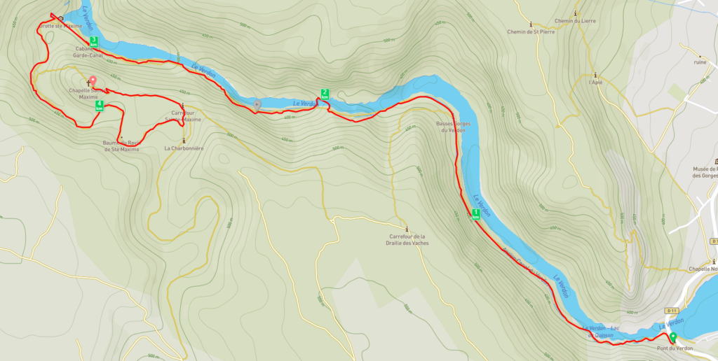 Le sentier des Basses Gorges du Verdon débute au parking du Musée de Préhistoire de Quinson et longe le Verdon pendant 3k300. Vous cheminerez le long d’un canal construit sous Napoléon III qui acheminait les eaux du Verdon à la ville d’Aix en Provence, puis atteindrez la cabane de l’ancien garde canal réaménagée en espace d’interprétation : présence de beaux panneaux qui apportent de précieux renseignements sur ce secteur protégé – espace naturel sensible et Zone Natura 2000. Après avoir passé le tunnel de 120m, vous emprunterez le chemin Ste Maxime jusqu’à la Chapelle du même nom. Retour par le GR99..