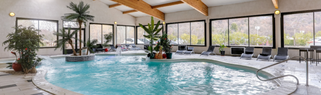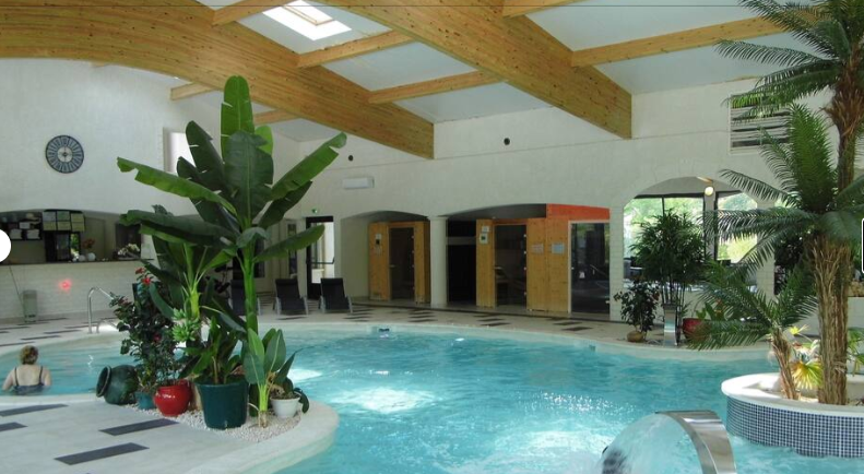 Piscine chauffée paysagée couverte avec jet, spa, contre courant, geysers, col de cygne, aqua bike.