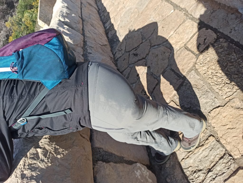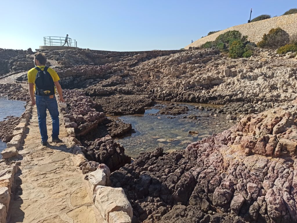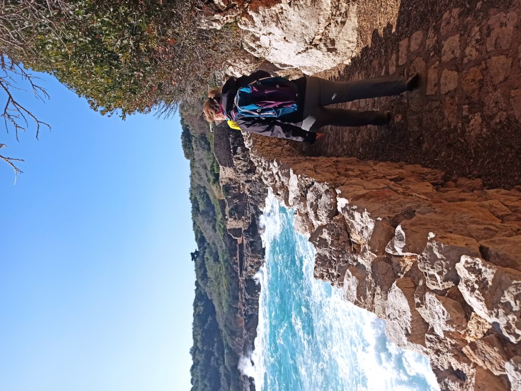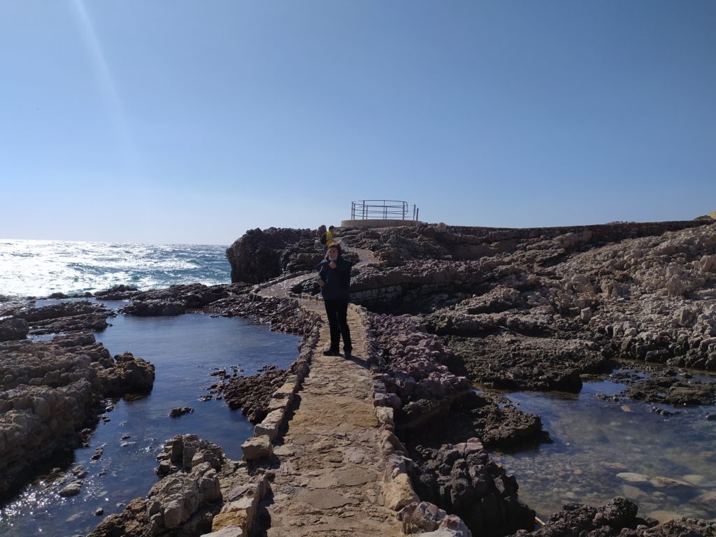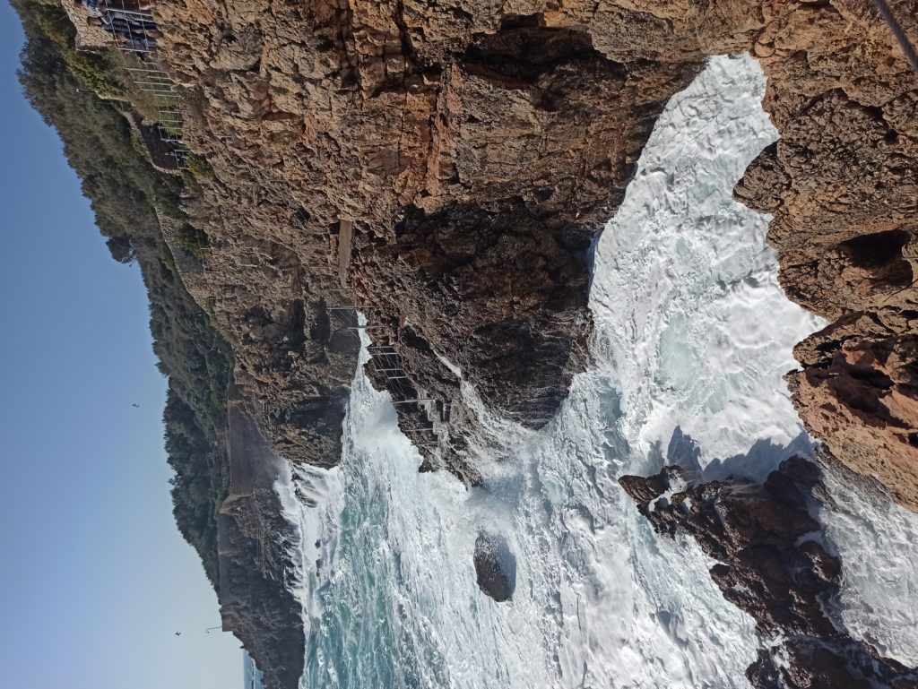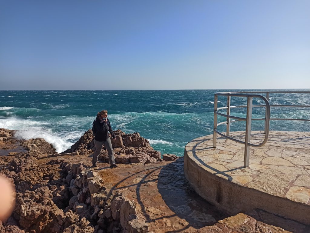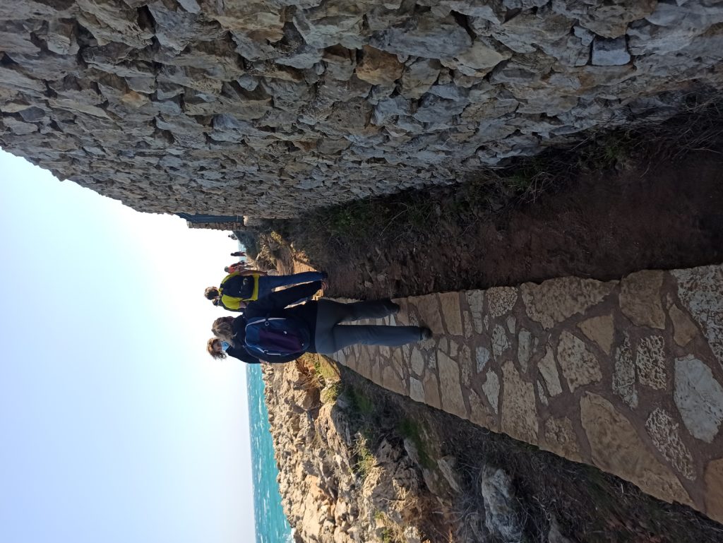 Bon alors la on voit bien les vagues qui passent par dessus, et bien on a traversé tout ça à la koh lanta soit en courant en verifiant la houle soit en crapahuantant sur les rochers coupants, car au debut on était tous en file indienne indienne et derrière une famille avec un gamin qui avait peur de descendre les marches pendant que toi derrière tu attends au mauvais endroit evidement et BIM Une vague sur la gueule, bon encore assez light juste côté gauche, blouson, poche, un peu pantalon et bras en polaire. A la première occasion on double ce troupeau et on fonce sur les rochers et on trace, on trace tellement qu’on se retrouve seuls personne devant à perte de vue ni derrière qui nous suit, je me suis meme rattrapée sur le cordage du garde corps pour éviter une vague de 10cm d’eau sinon adieu les pieds au sec