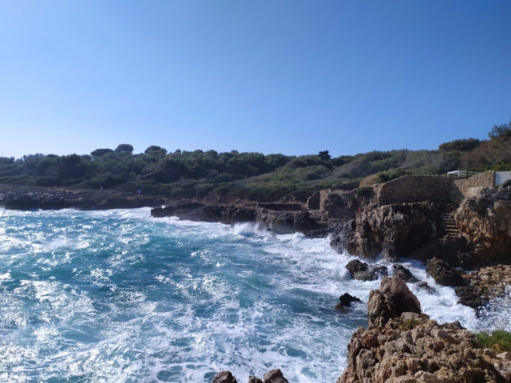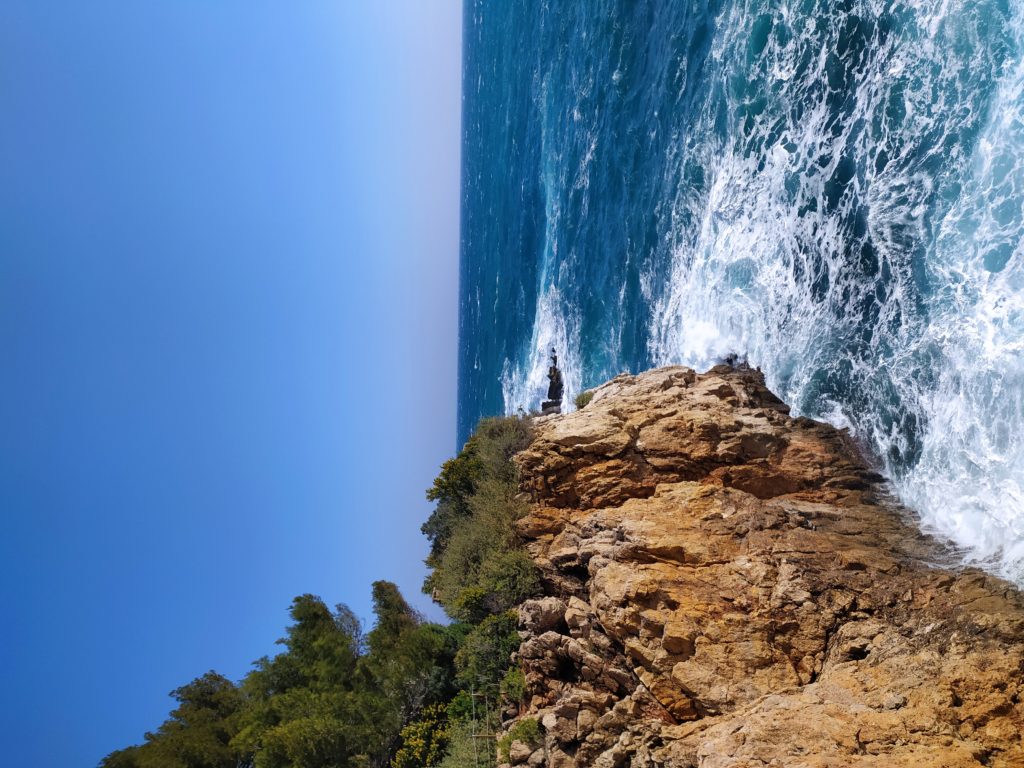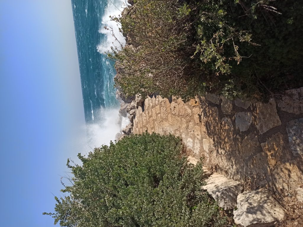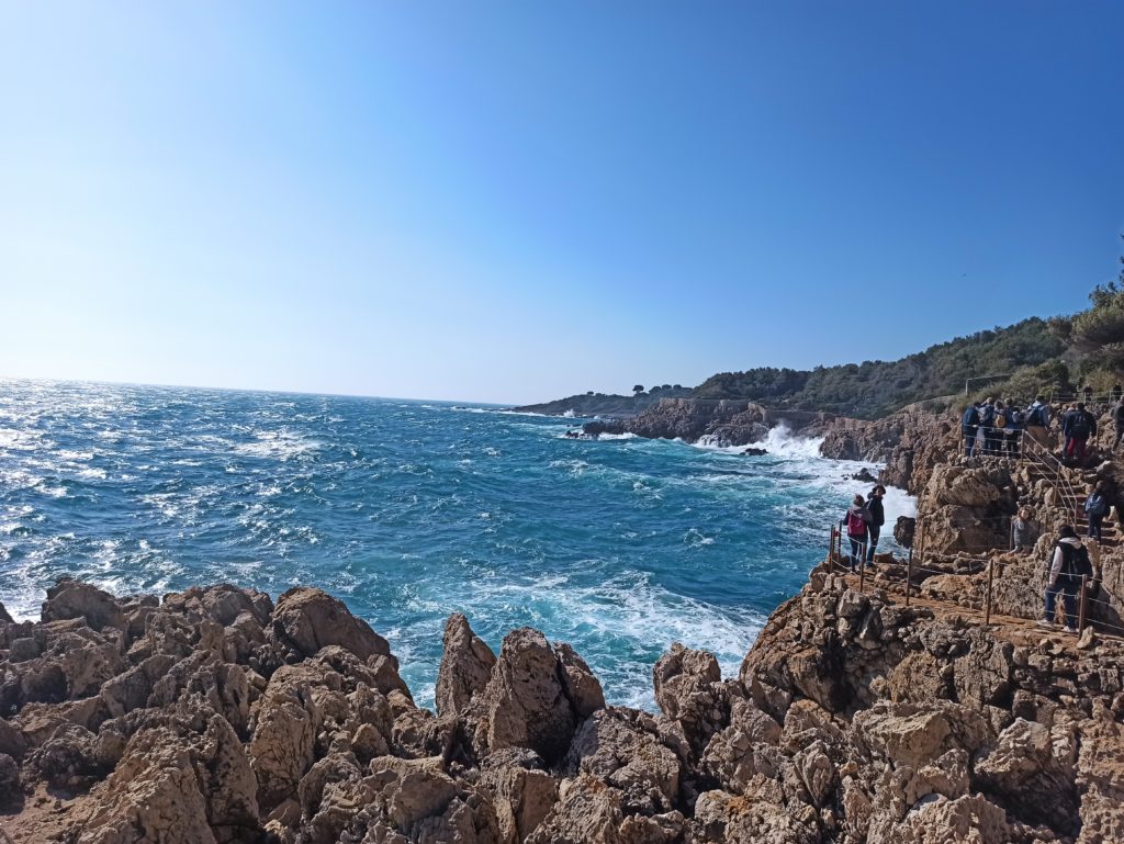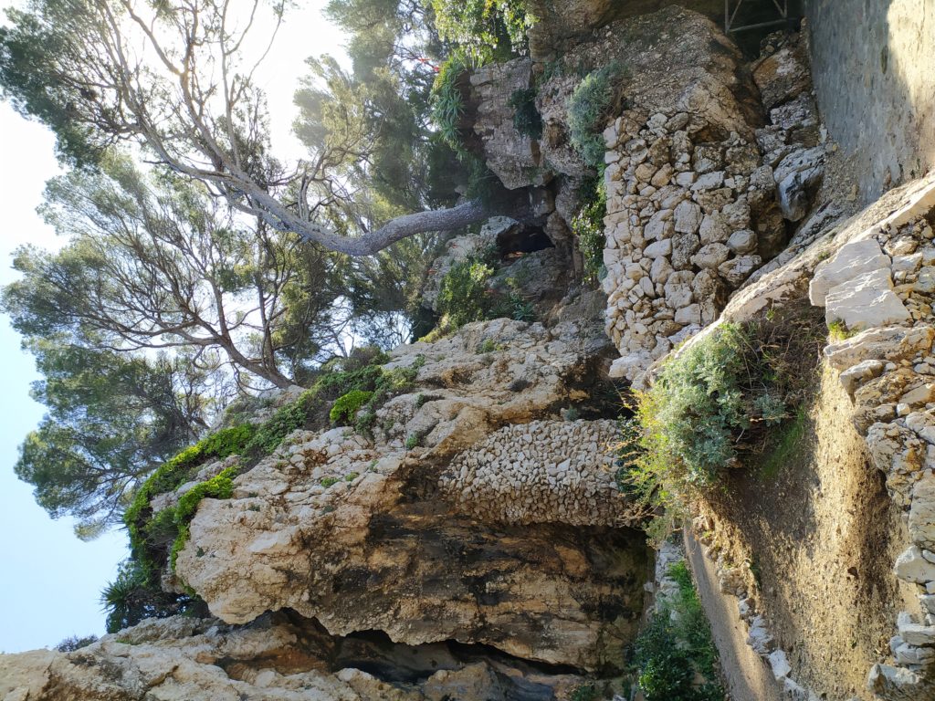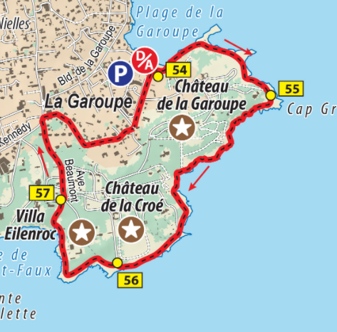 avant de longer les murs ceinturant les grands parcs des châteaux de la Garoupe et de la Croé (b.56) : le tracé sinueux et parfois étroit court au bord des falaises en contournant de petites criques