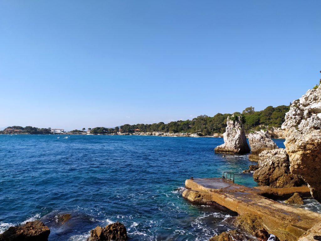 Du parking de la Garoupe, juste après la plage homonyme (b.54), s’engager sur le large chemin piétonnier qui borde la côte face aux remparts du vieil Antibes ; on parvient ainsi à une anse entourée de deux langues de terre (panorama sur Antibes et tout l’Est de la Côte d’Azur).
