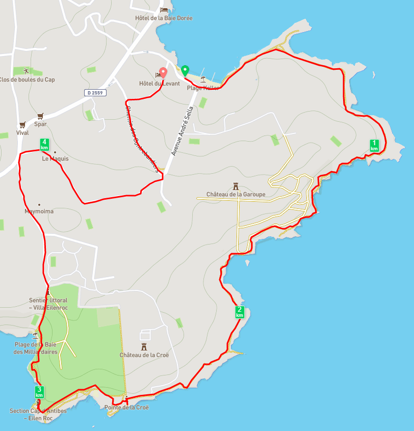 Deuxième jour du week end avec Magali, direction Antibes pour faire le tour du Cap, depuis la plage de la Garoupe. 5km prévue 2h (à l’arrivée 1h30)