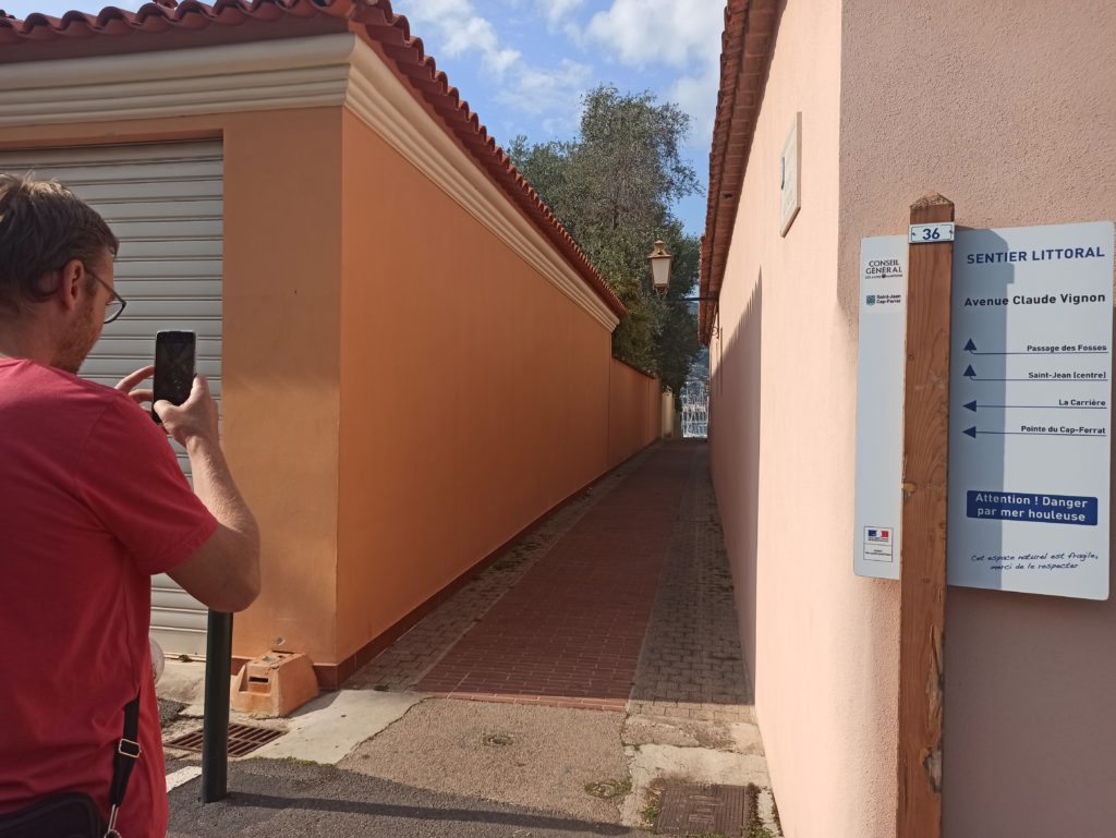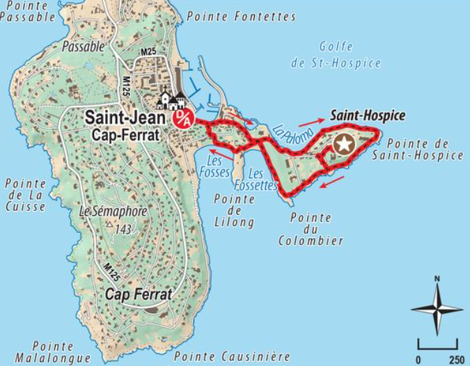 Depuis le port de St-Jean-Cap-Ferrat dont on suit les quais où mouillent yachts de prestige, voiliers et simples barques de pêche, dépasser la place du village et remonter vers l’Est sur 300 m environ la route de St-Hospice en longeant le palace de la Voile d’Or ;